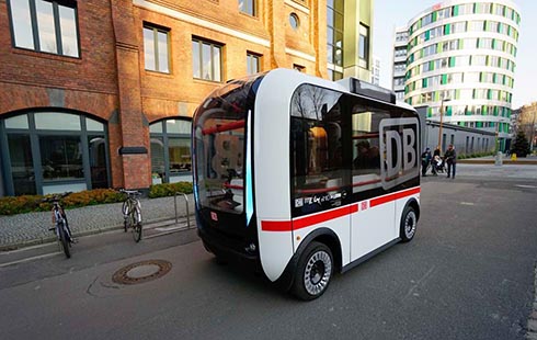 Auf dem Berliner Euref-Campus testet die Deutsche Bahn eine autonom fahrende Buslinie. Als Testfahrzeuge fiel die Wahl auf die bereits bekannten "Ollis" der Firma Local Motors aus den USA.