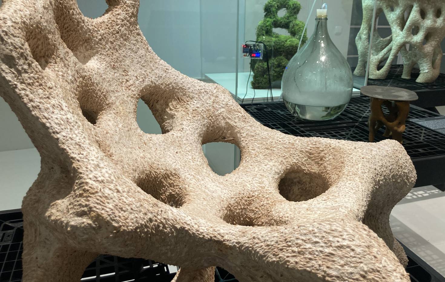 Pilzmaterialien werden für Designer immer interessanter. Prof. Dr. Sascha Peters präsentiert Beispiele zur Verwendung in komplexen Produktgeometrien und zeigt erste Ergebnisse des Forschungsprojekts "Mycoustics".